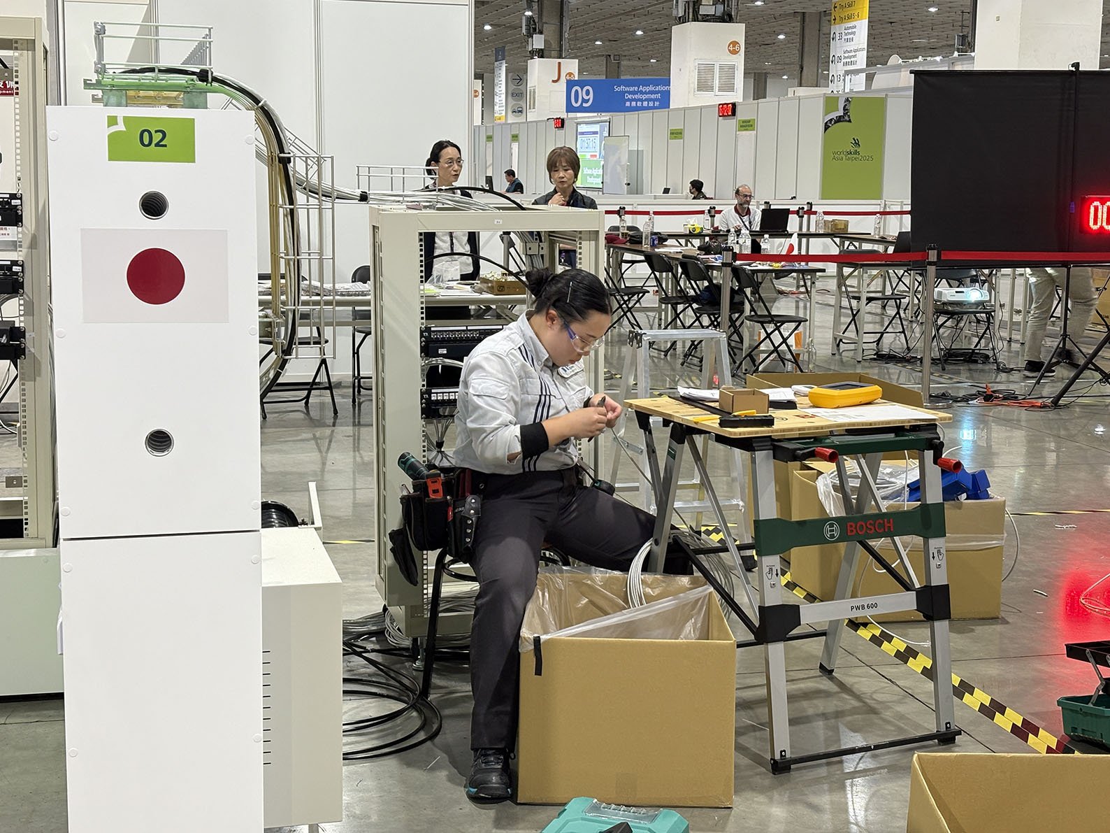 入社後は、ハイパーテクノポートセンタにて週5日、朝から晩まで技術研鑽に没頭しました。日頃は国内大会の仕様で訓練をしていましたが、今回、会社は私の挑戦のために、国際大会の仕様を忠実に再現した専用の訓練ブースを整備してくれました。通常の訓練では、3〜4人の選手が指導員や先輩のサポートのもと、コンマ1秒を削るための反復練習を行います。 訓練は孤独な戦いになりがちですが、ミライト・ワンには「チームで戦う」文化があります。伸び悩む時期には、上長から「今、身につけている技術は必ず現場で通用する」と声をかけられ、その言葉が私の支えとなりました。 また、組織のバックアップは技術面だけにとどまりません。実は大会直前、渡航に必要な重要書類に関わるトラブルが発生した際も、関西から最終便を駆使して物資を届けてくれるなど、緊急時の対応力にも救われました。こうした組織全体の「本気」の支援があったからこそ、私は競技にのみ集中し、世界の舞台に立つことができたのです。